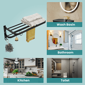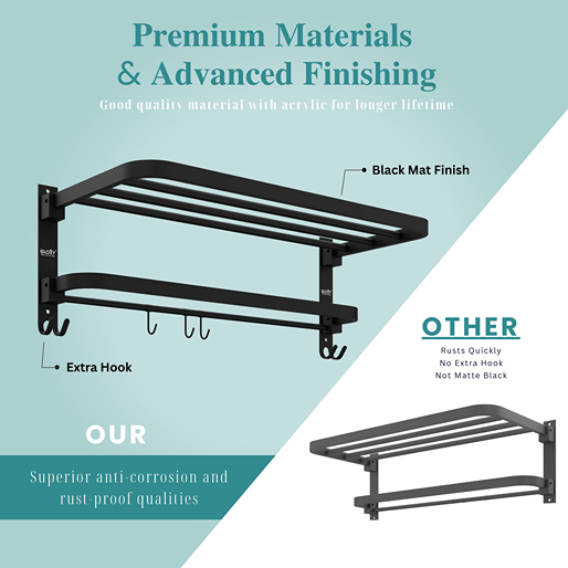 Rust-Resistant Construction: Perfect for high-moisture areas such as bathrooms., Space-Saving Foldable Design: Easily fold the rack when not in use for compact storage., Matte Black Finish: Adds a sophisticated touch to any bathroom or laundry room., Multiple Hooks & Hanger: Versatile storage for towels, clothes, and accessories., Easy Installation: Includes necessary hardware for quick setup.
