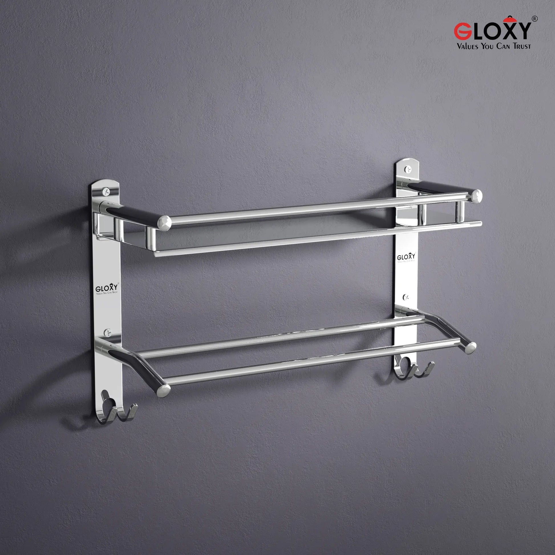 Gloxy Stainless Steel 2-Layer Chrome Finish Bathroom Shelf with Towel Rod