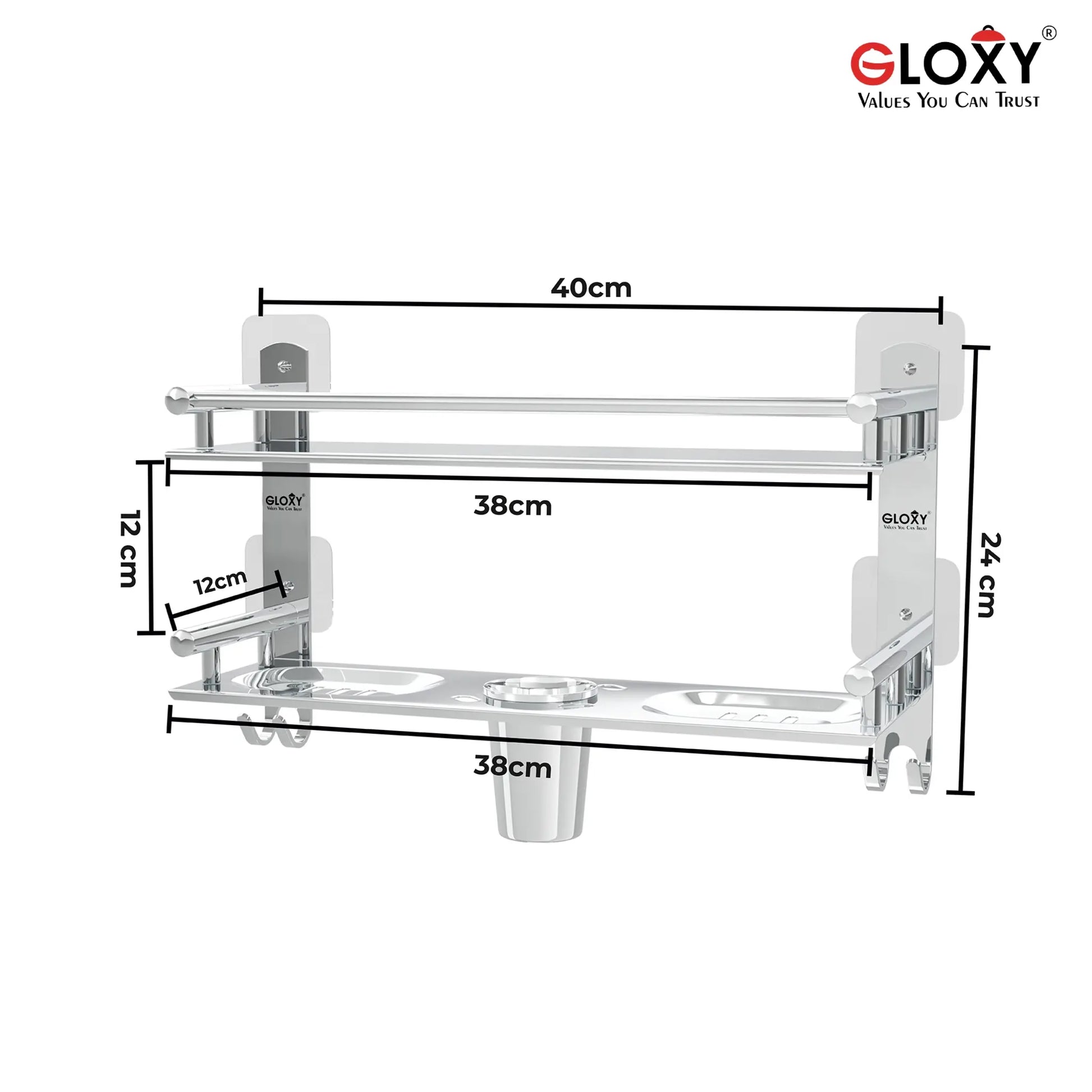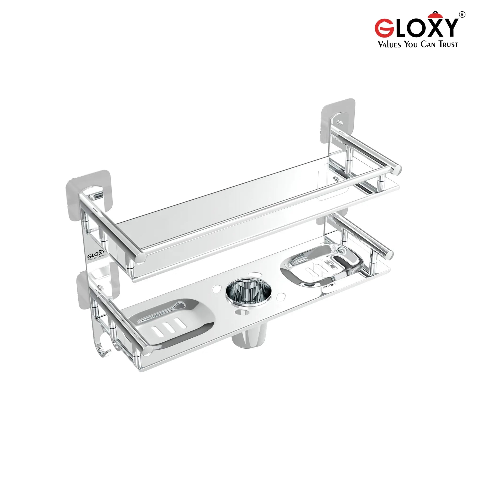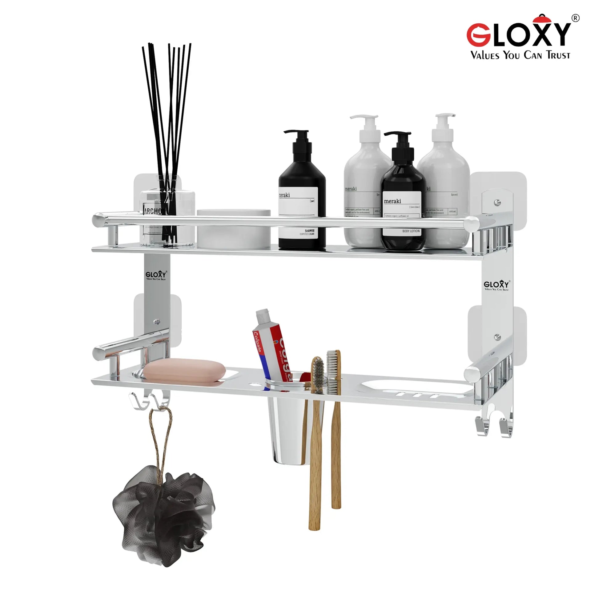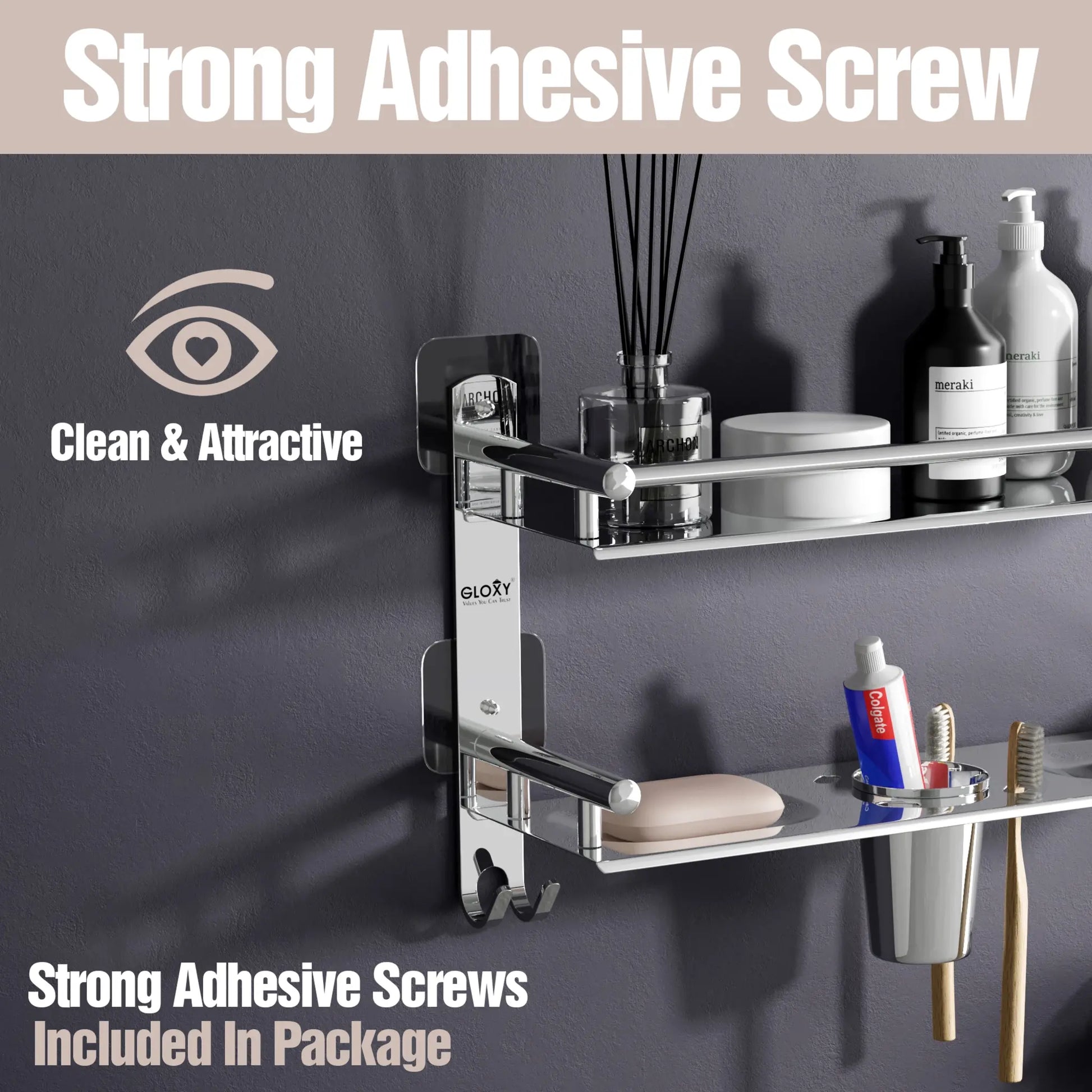 Gloxy Stainless Steel 2-Layer Chrome Finish Bathroom Shelf with Soap Dish, Tumbler Holder, Hooks-Adhesive Sticker Installation