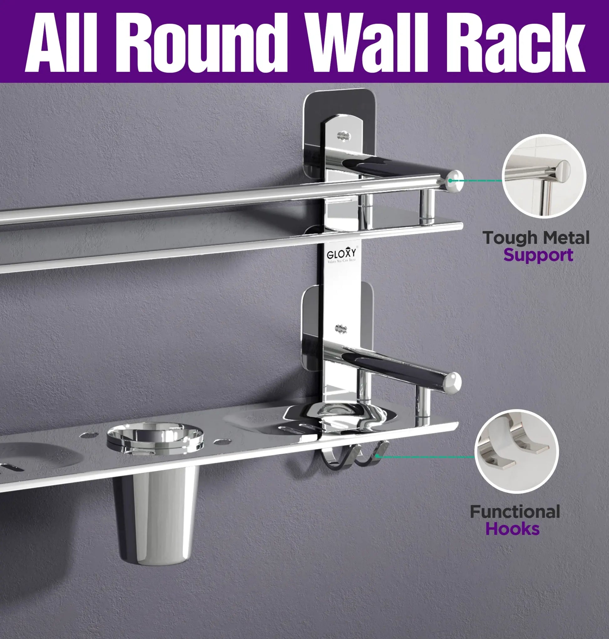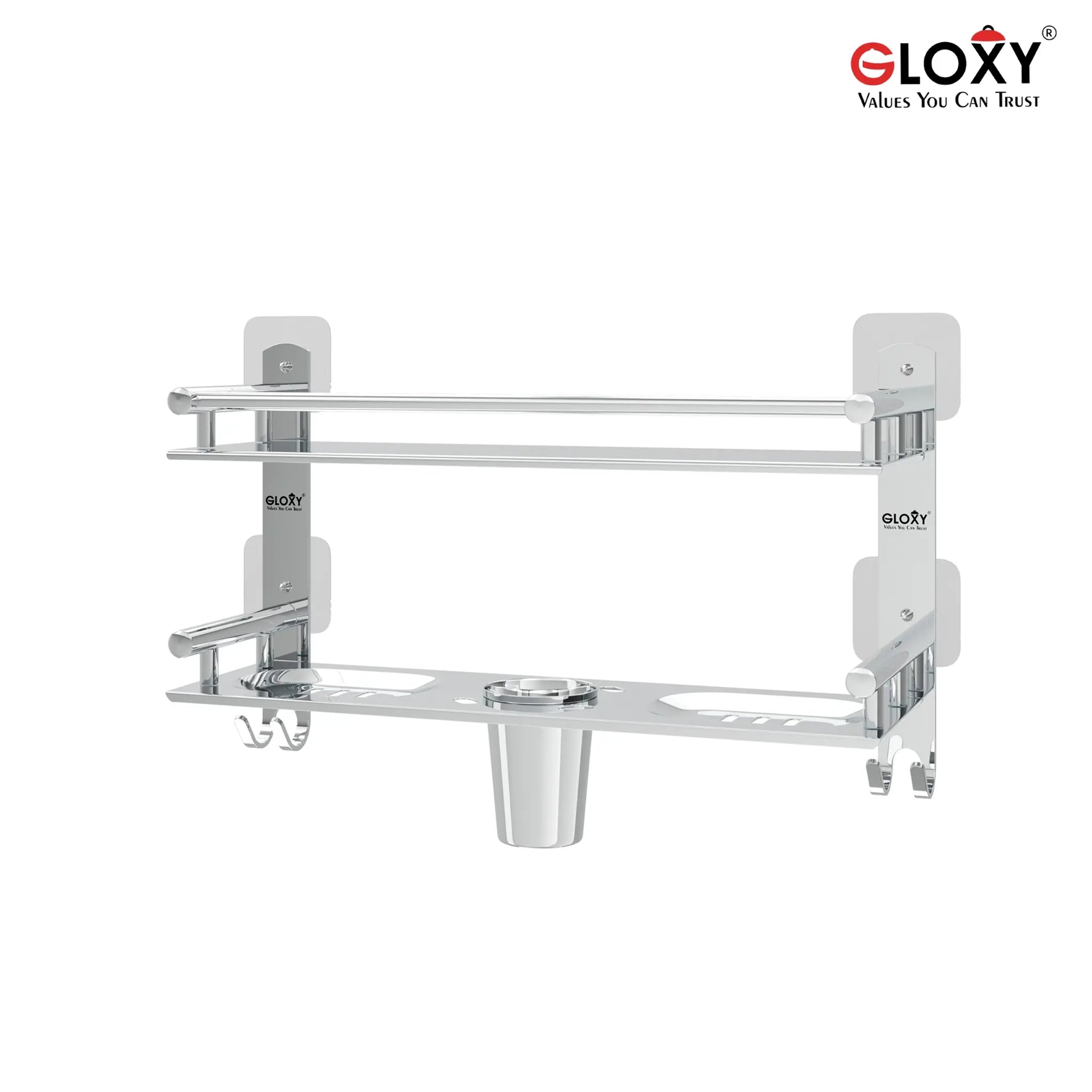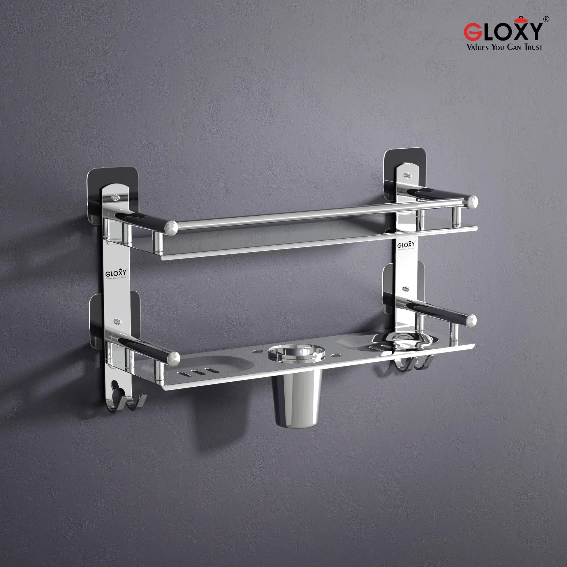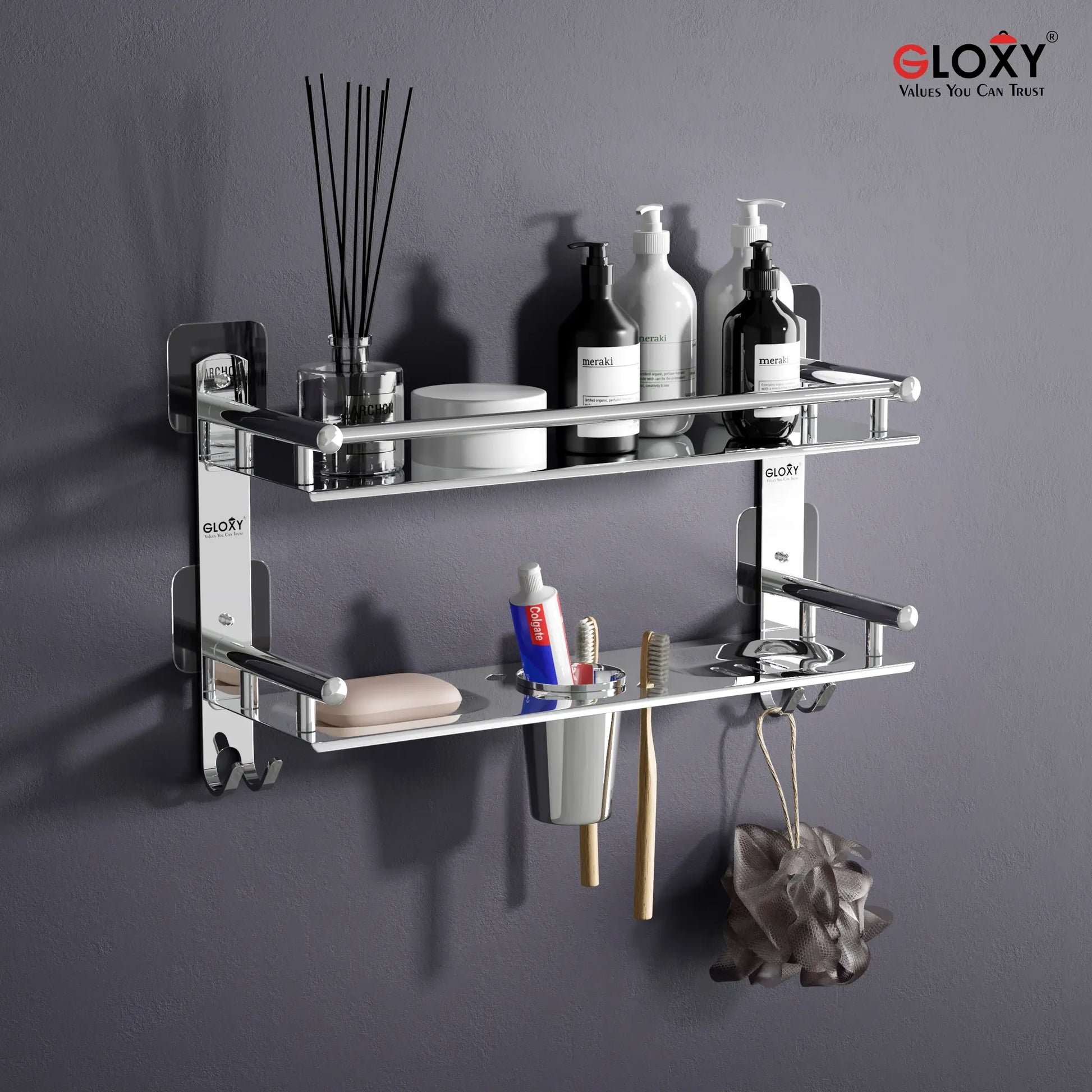 Gloxy Stainless Steel 2-Layer Chrome Finish Bathroom Shelf with Soap Dish, Tumbler Holder, Hooks-Adhesive Sticker Installation