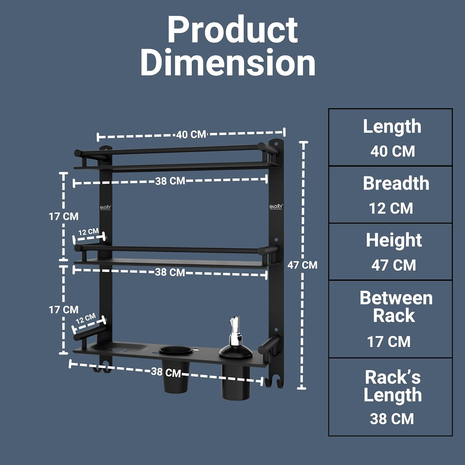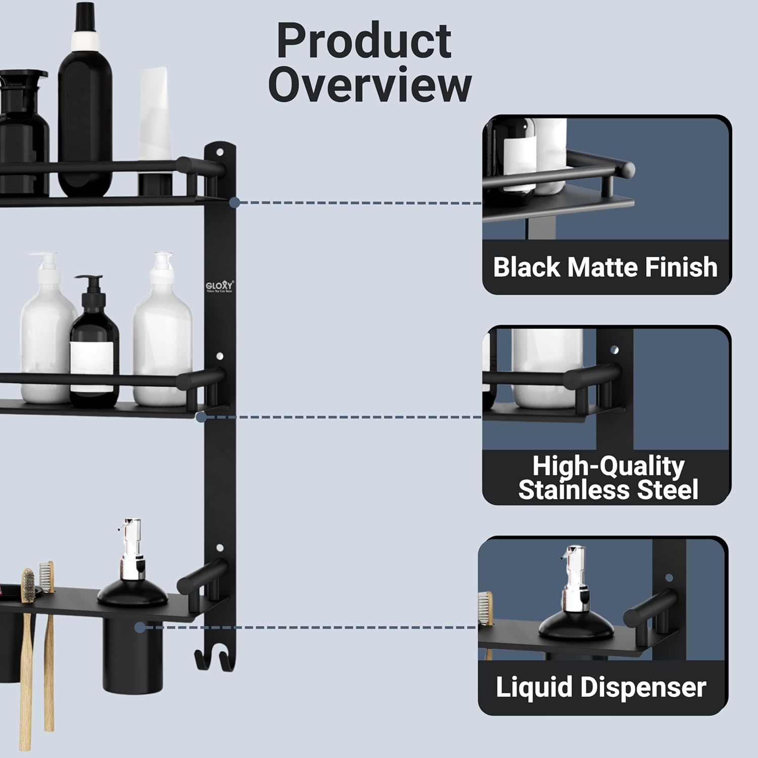 Gloxy Stainless Steel 3-Layer Chrome Finish Bathroom Shelf With Soap Dish,Liquid Dispenser,Tumbler Holder & Hooks