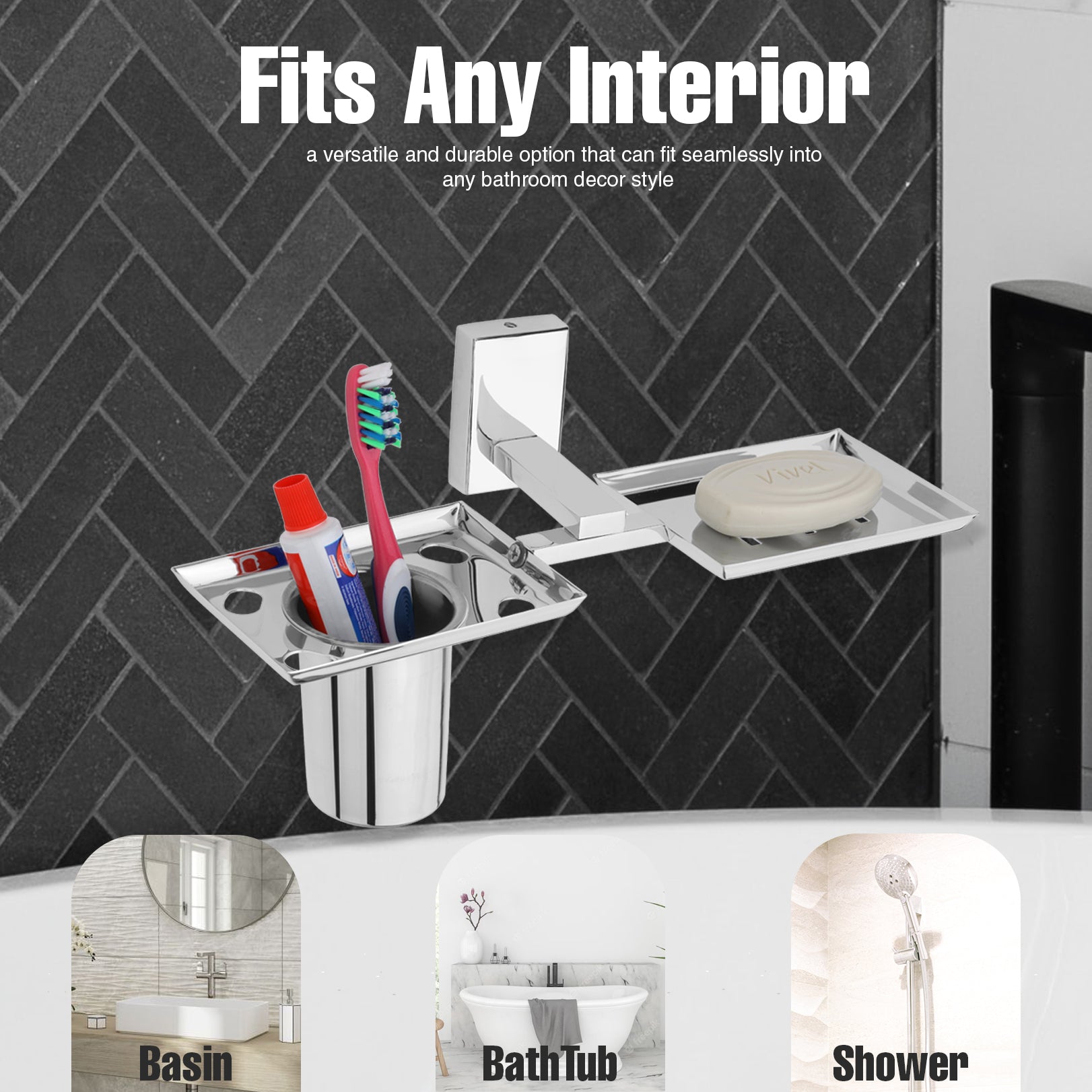 Gloxy Rectangular Shape Stainless Steel 304 Grade Chrome Finish Single Soap Holder With Tumbler Holder